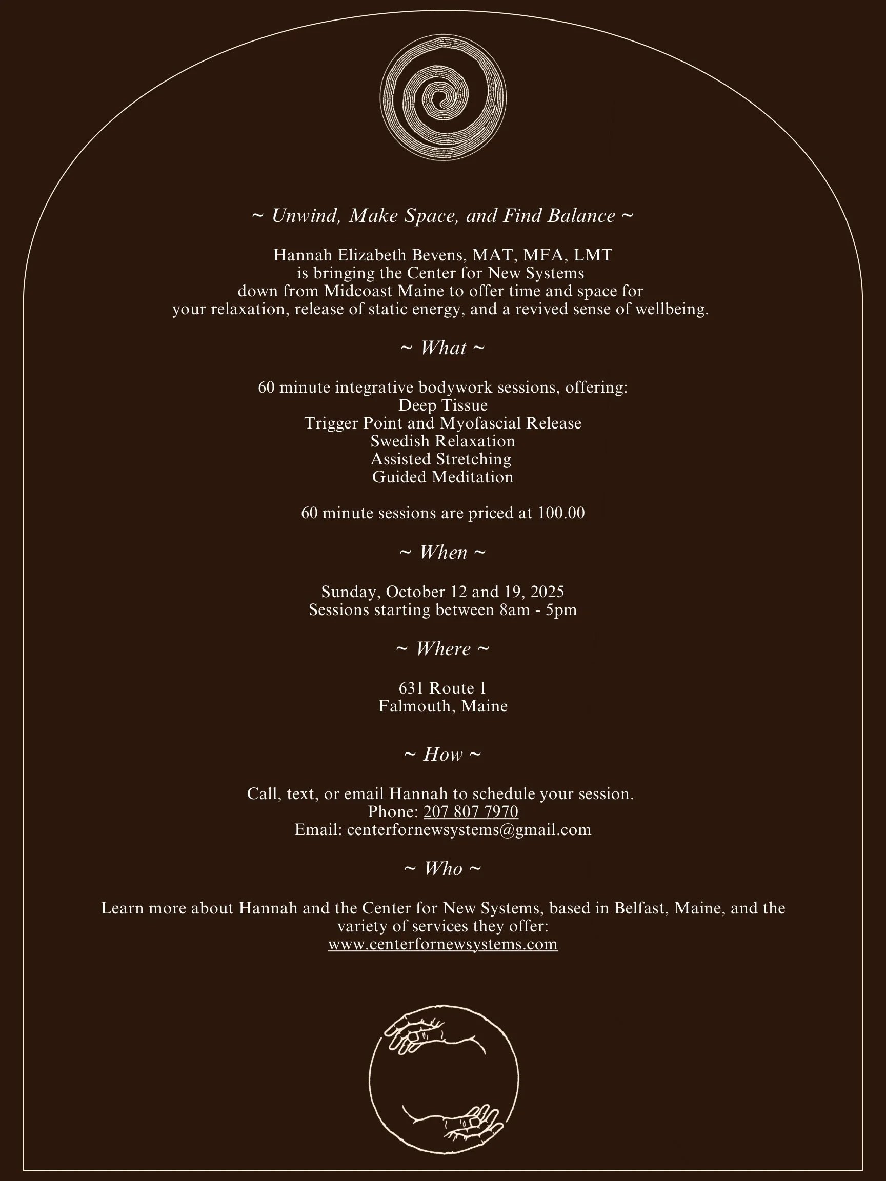 Center for New Systems Pop Up in Falmouth, Maine - Offering 60 minute Integrative Bodywork sessions. Using therapeutic techniques, such as Deep Tissue, Swedish Relaxation, Trigger Point and Myofascial Release, Assisted Stretching, and Guided Meditation, we can curate a session that meets your unique needs in mind and body.